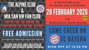 Kick off at 12:30 p.m. on the big screen, at the Alpine Club, 464 Maple Avenue, Kitchener.